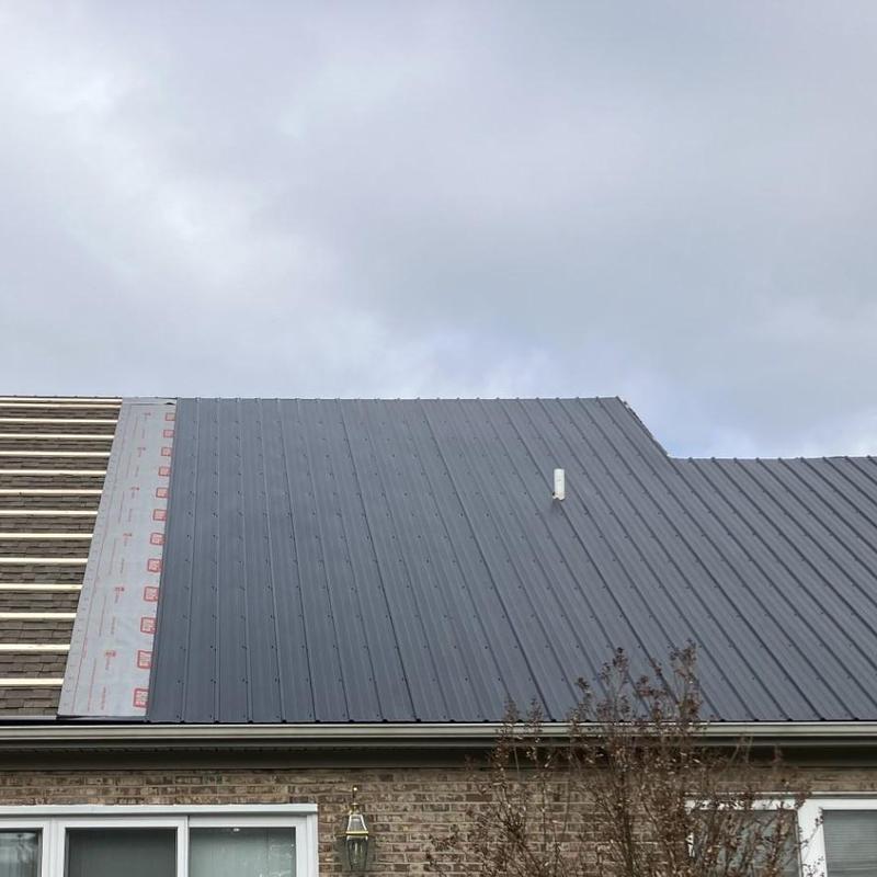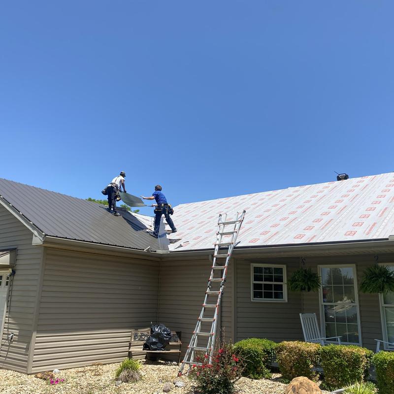 SCC Commercial and Metal Roofing installed 1x4 boards spaced two feet apart and laid synthetic felt across the surface. The crew then installed 28-gauge Everlast metal panels. This metal roofing project took place in Tollesboro, Kentucky.