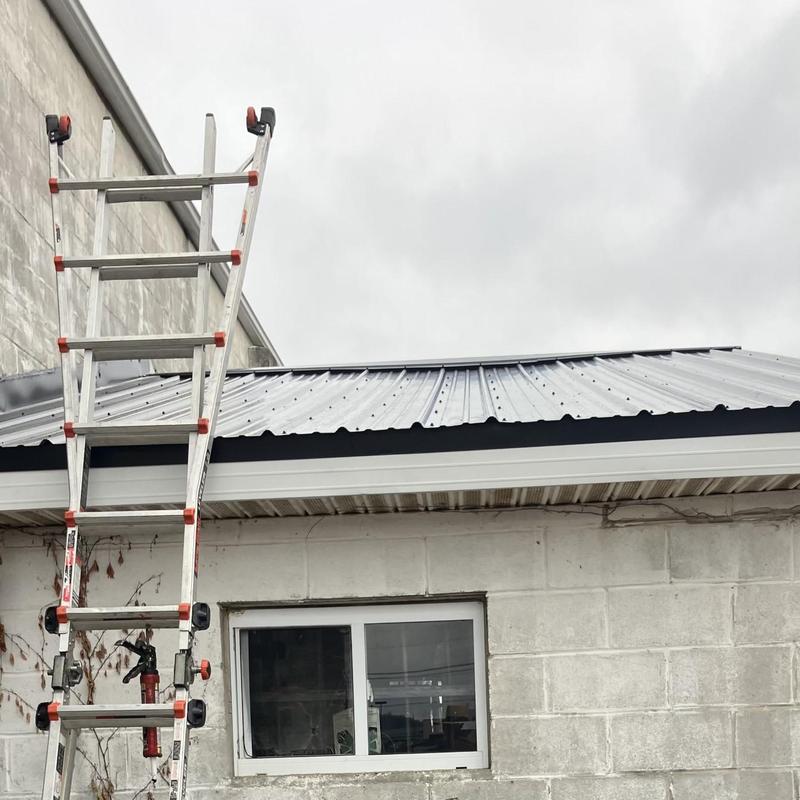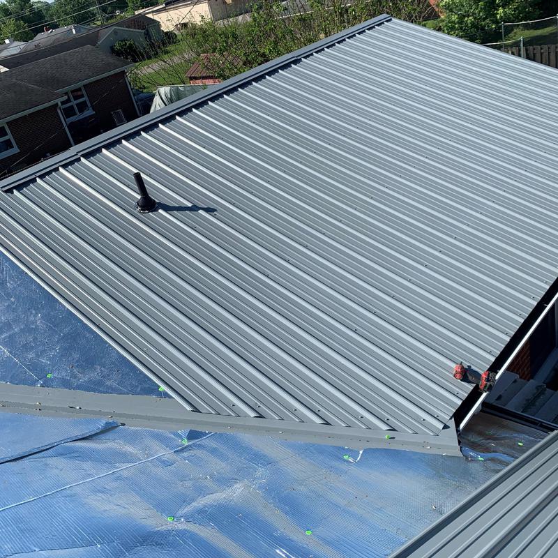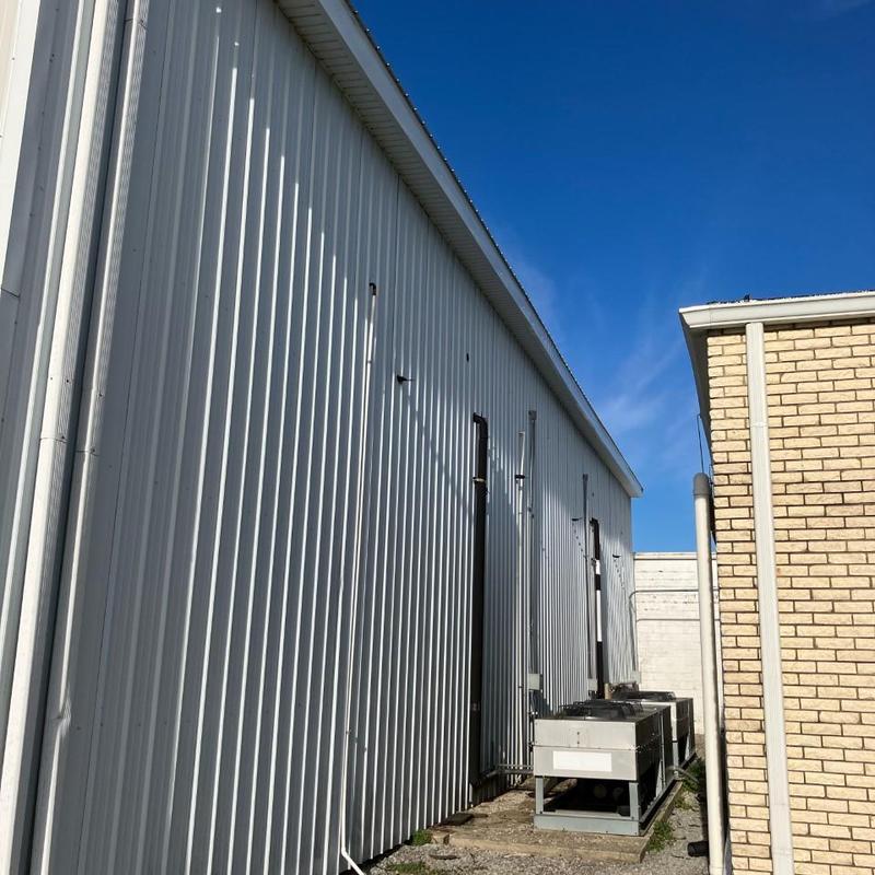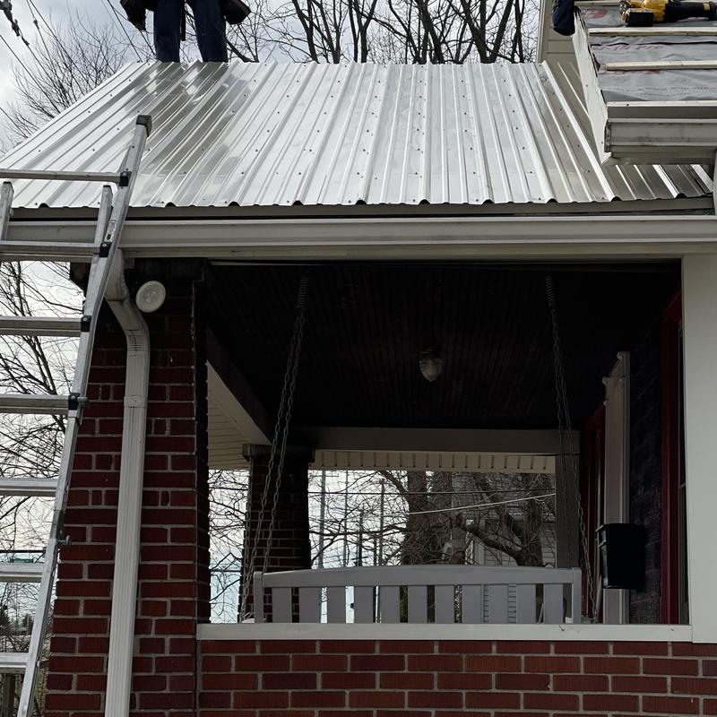 SCC Commercial and Metal Roofing replaced a damaged lean-to roof in Covington, Kentucky. The crew removed old metal and rotten sheeting, installed new 2x4 roof decking, applied a vapor barrier, and added drip edges. They sealed seams with mastic, installed 28-gauge Everlast metal panels, a metal pipe boot, and finished all roof corners.