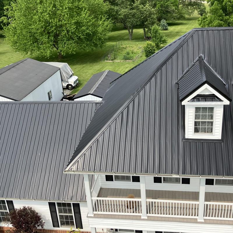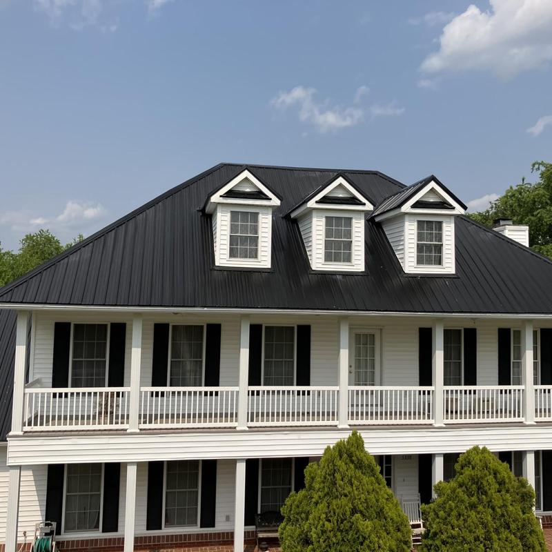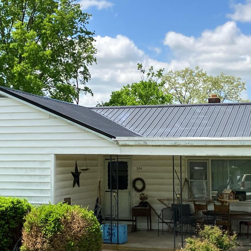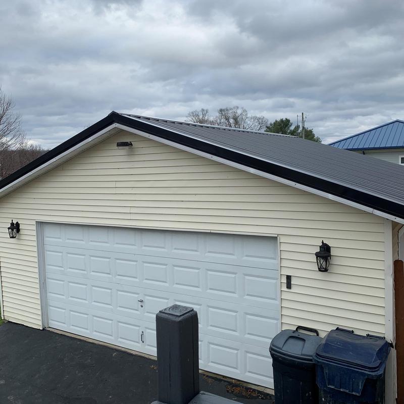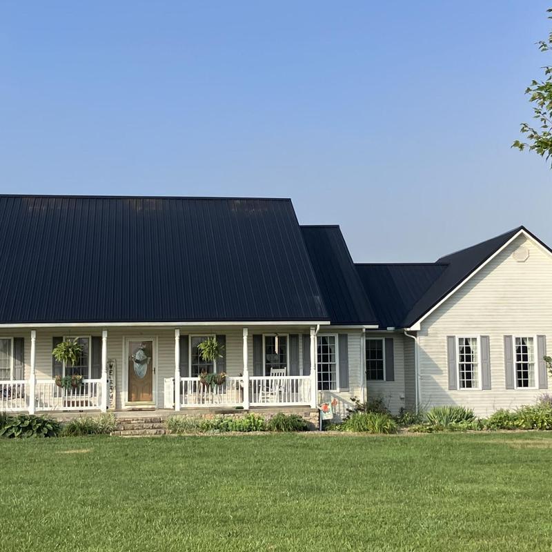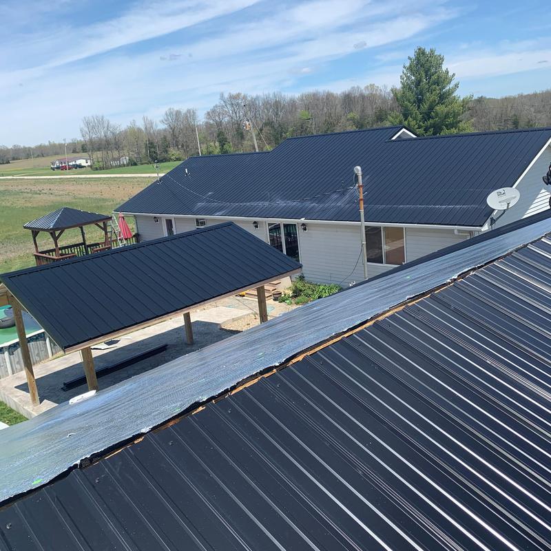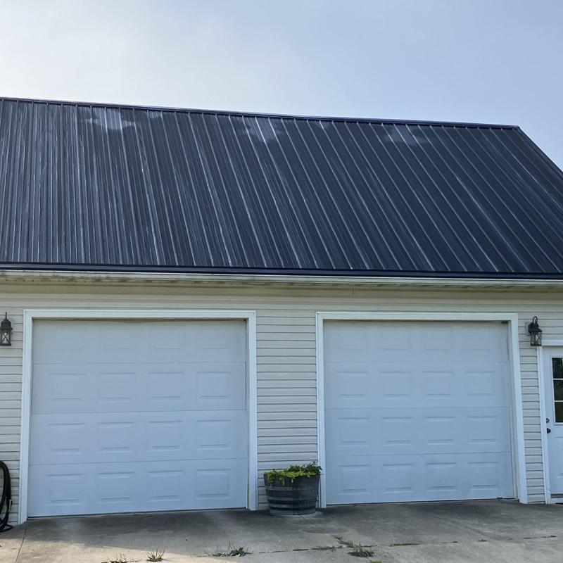SCC Commercial and Metal Roofing installed a black 28-gauge Everlast metal roof on a garage in Vanceburg, Kentucky. The project matched the existing house roof and included a craftsmanship warranty. The team provided consistent roofing work for a returning homeowner, ensuring uniform coverage across both structures.