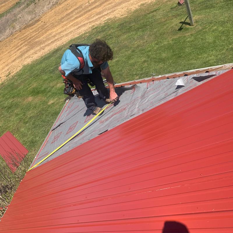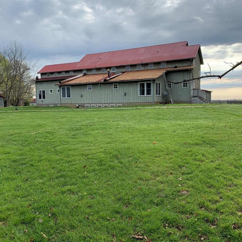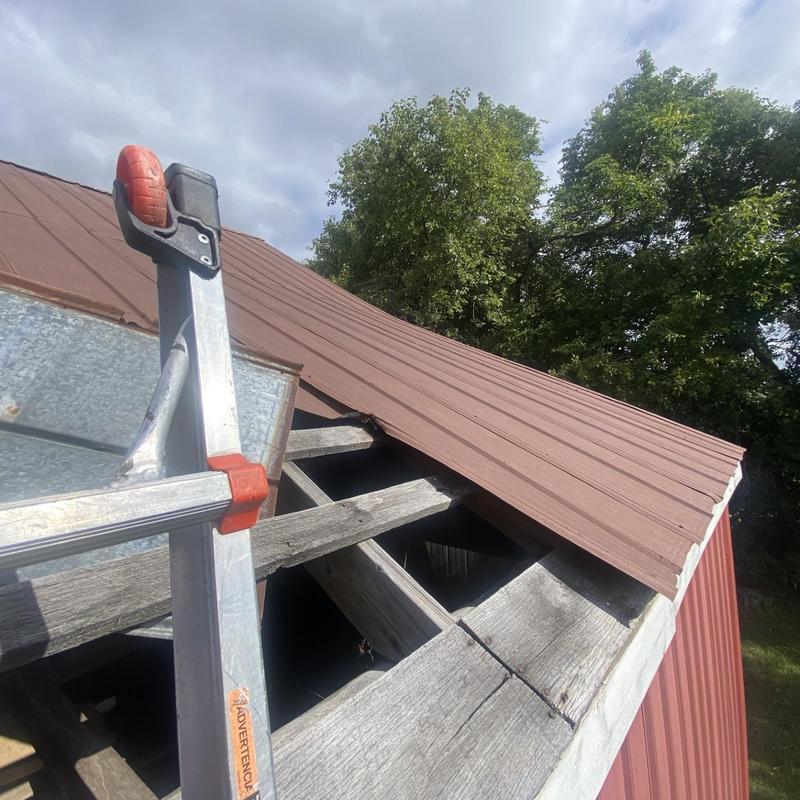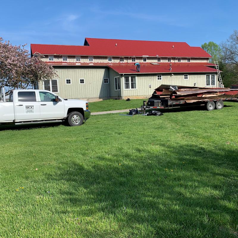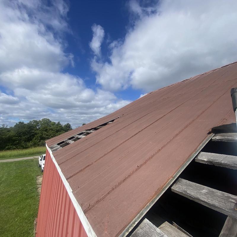 SCC Commercial and Metal Roofing repaired a barn roof in Vanceburg, Kentucky after wind damage. The team worked with insurance to approve the repair and replaced damaged sections using 5V and Crimson Red metal roofing along with new wood sheeting. This project restored the roof's structure and protected the building from further weather damage.