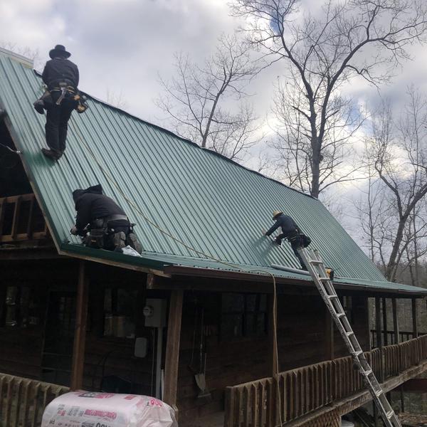 SCC Commercial and Metal Roofing installed a metal roof on a cabin using ropes and climbing harnesses for safety. The crew attached 1x4 boards to support the metal panels. This roofing project took place in Falmouth, Kentucky.