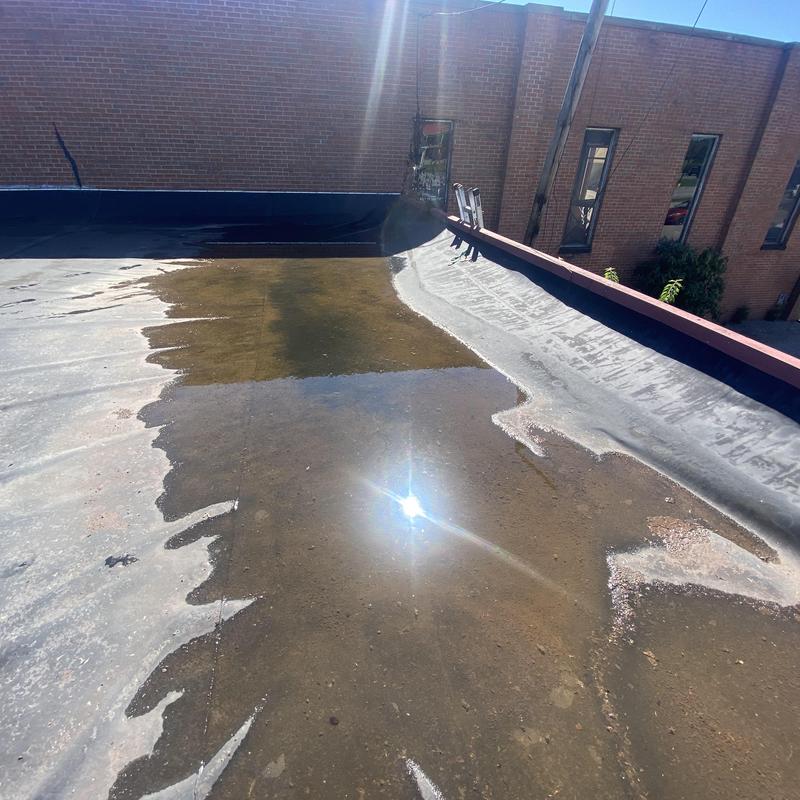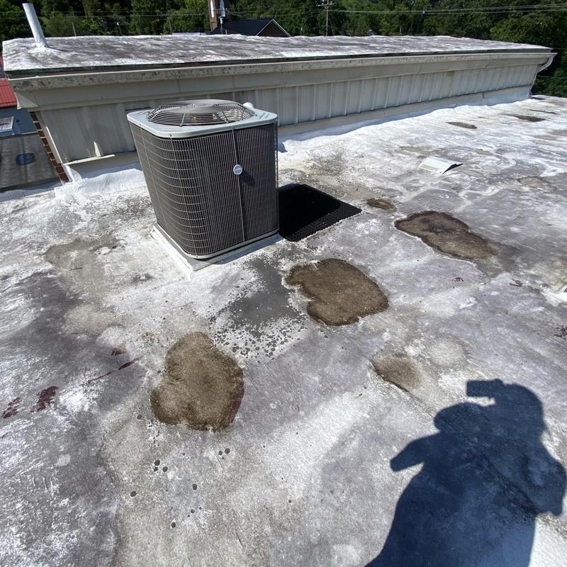 SCC Commercial and Metal Roofing repaired a 15'x17' section of single-ply roofing in Hillsboro, Ohio. They removed bubbles, dried the insulation board, and cleaned the surface with brushes and cleaners. The team then applied Enduris liquid flashing to HVAC curbs and seams before coating the area with Enduris roof coating.