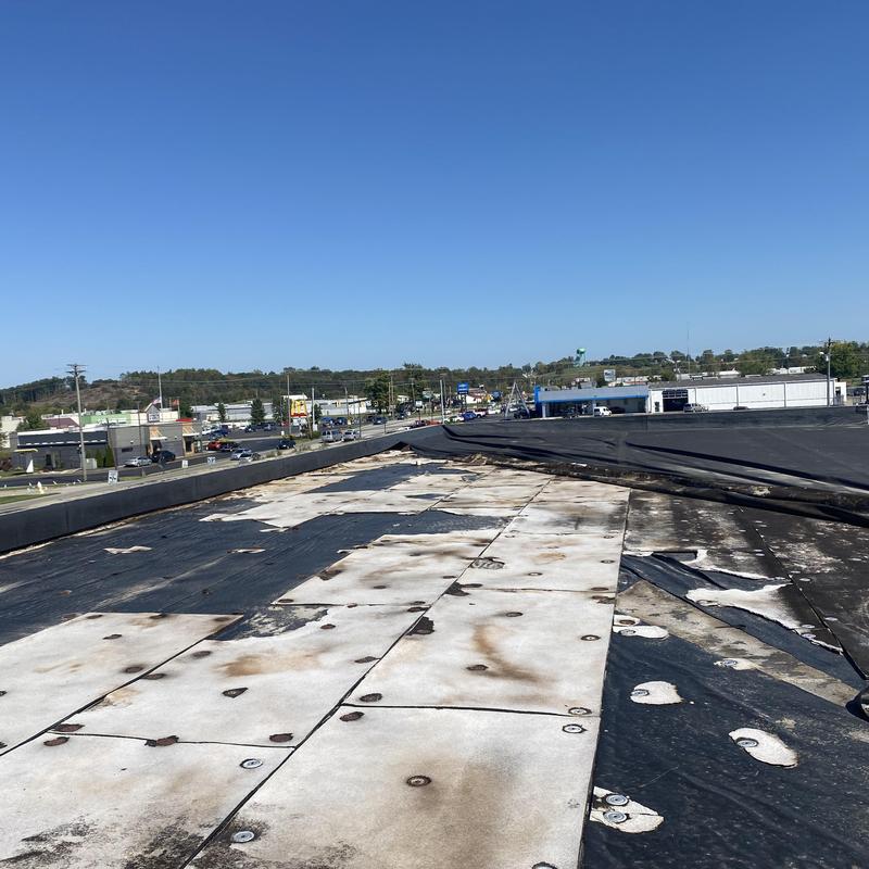 SCC Commercial and Metal Roofing removed multiple roofing layers and installed new insulation and single-ply membrane on a steel roof deck in Vanceburg, Kentucky. Workers mechanically fastened insulation, thermally fused membrane seams, reinstalled pipes with proper boots, and sealed parapet walls without cap trim to complete a full roof replacement.