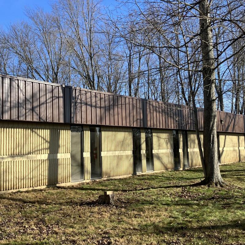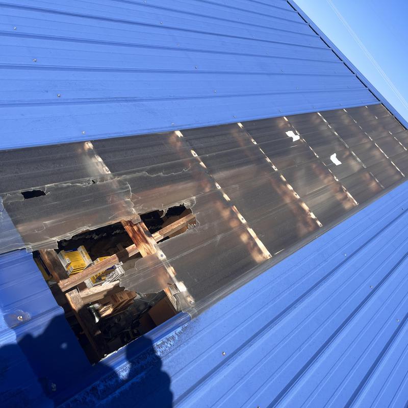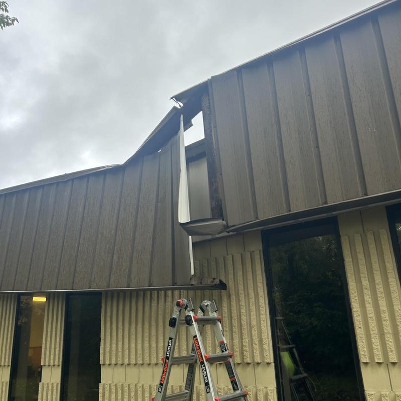 SCC Commercial and Metal Roofing repaired storm damage to a commercial facade in Batavia, Ohio. The team removed 110 feet of damaged facade, installed structural lumber backing, applied Reverse Ran PBR 26-gauge metal panels, and finished with fascia and cap trim. They reinstalled lighting and protected the ground with plywood during equipment use.