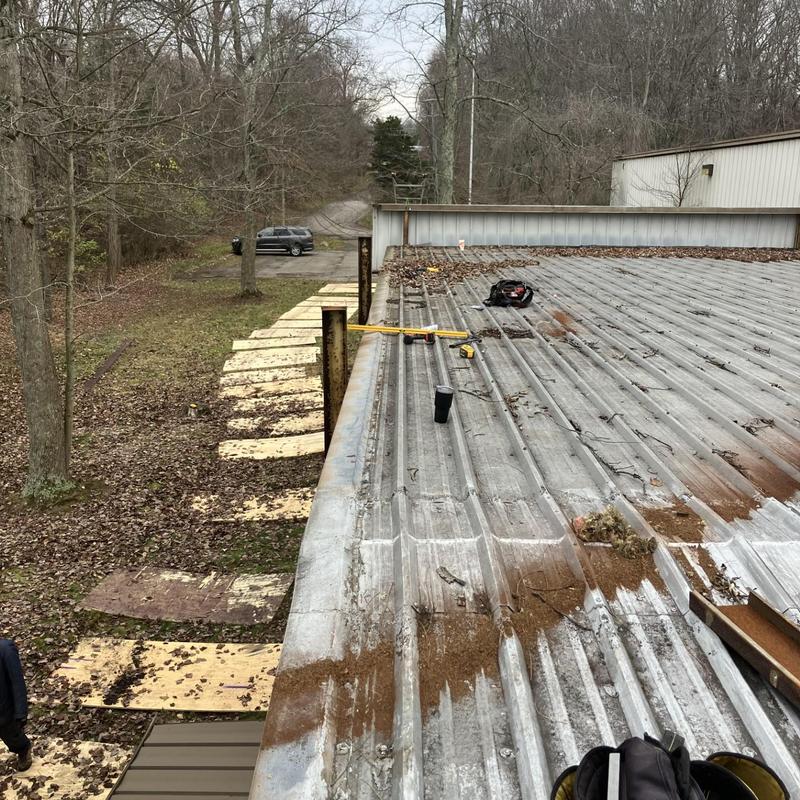 SCC Commercial and Metal Roofing installed a temporary roof solution for a storm-damaged building in Vanceburg, Kentucky. High winds had damaged the existing roof, and the property owner is awaiting an insurance assessment. The temporary work helps protect the structure from further weather exposure during the insurance process.