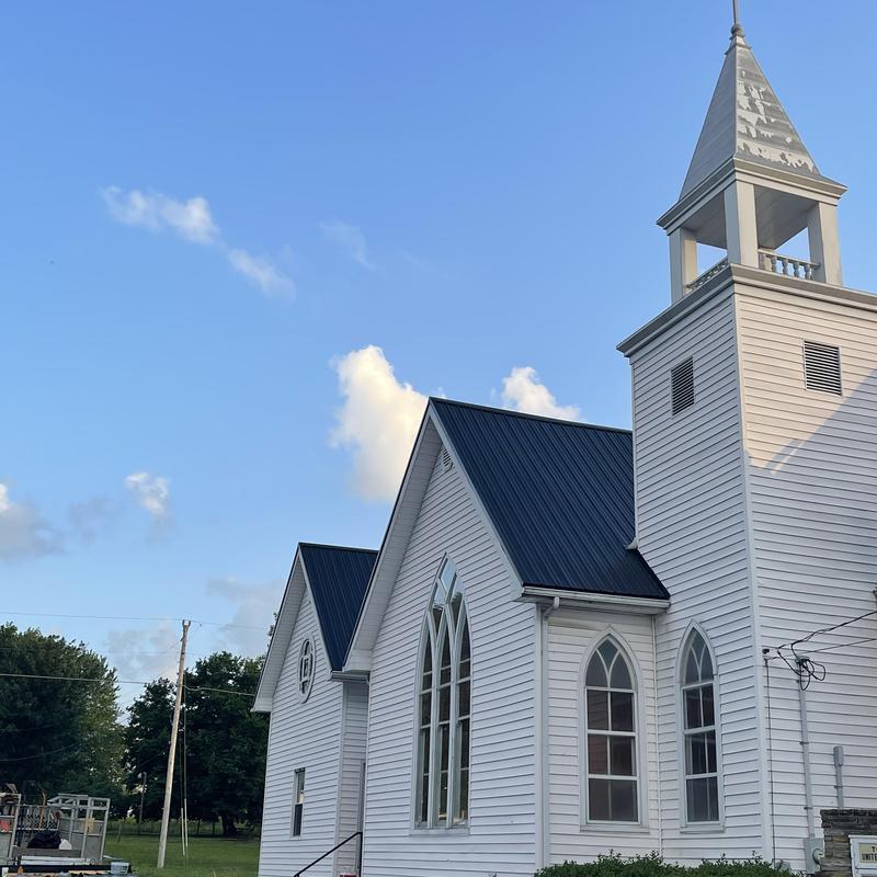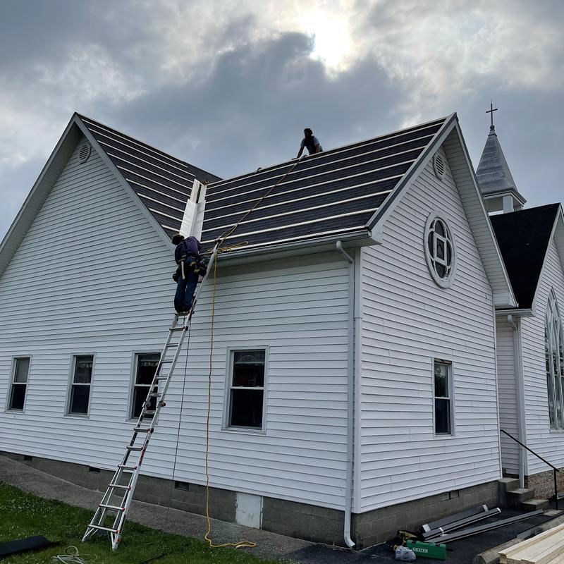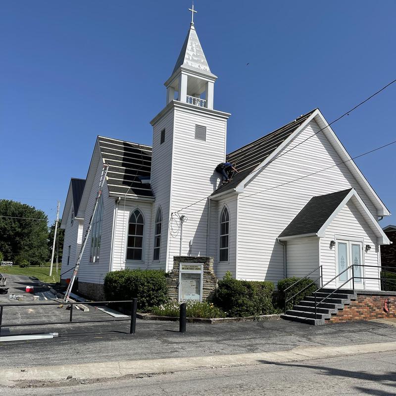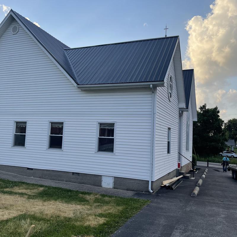 SCC Commercial and Metal Roofing installed 1x4s spaced two feet apart and applied #1 28-gauge Everlast metal panels on a church roof in Vanceburg, Kentucky. The project involved careful trim installation and accommodated the steep roof pitch for a secure, long-lasting metal roofing system.