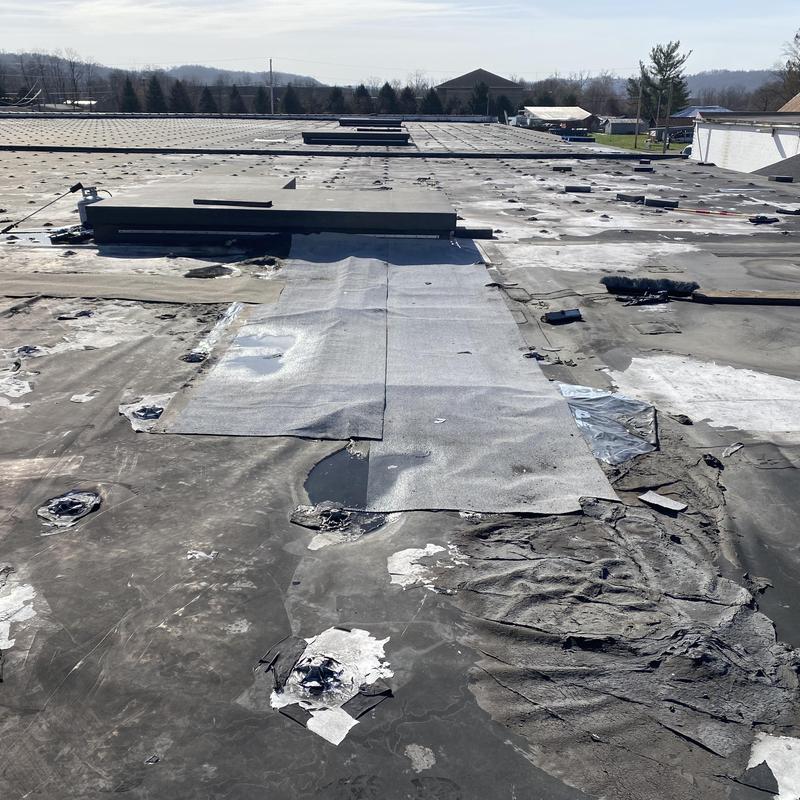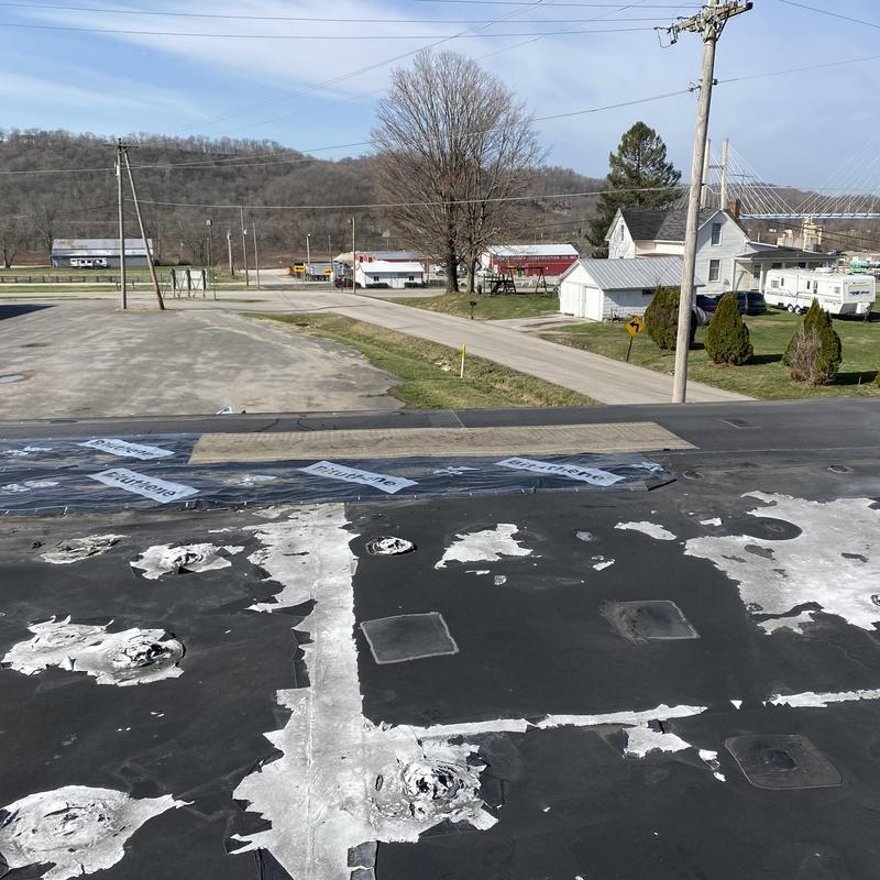 SCC Commercial and Metal Roofing placed emergency tarps on a wind-damaged roof after a recent storm in Morehead, Kentucky. The crew secured the damaged areas and is now awaiting insurance approval before starting full roof repairs. This service helps prevent further damage while the assessment process continues.